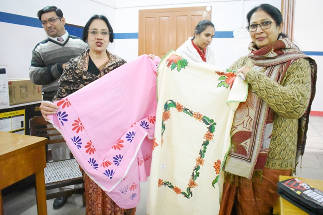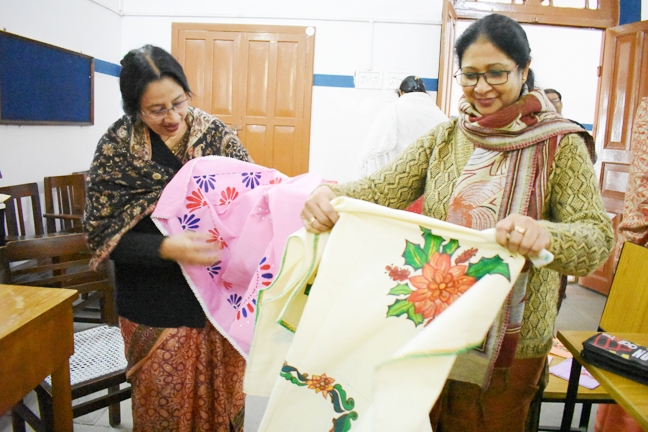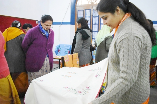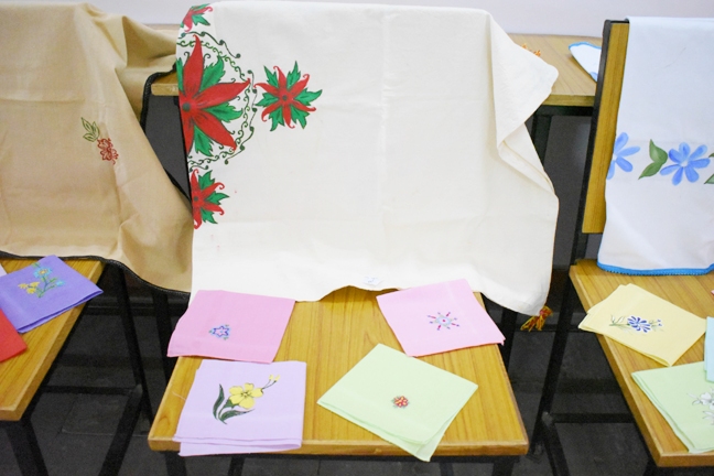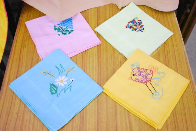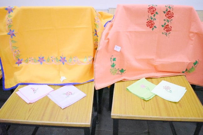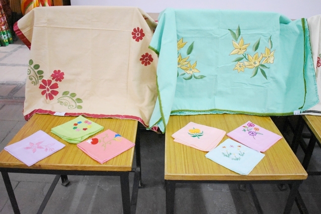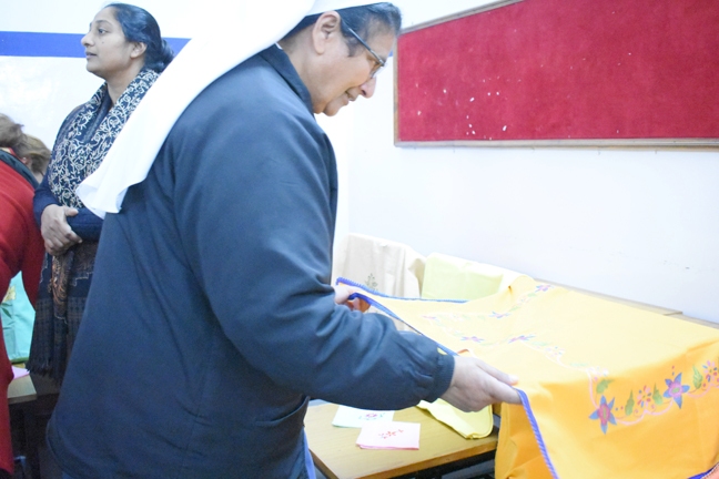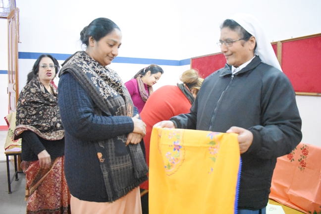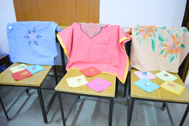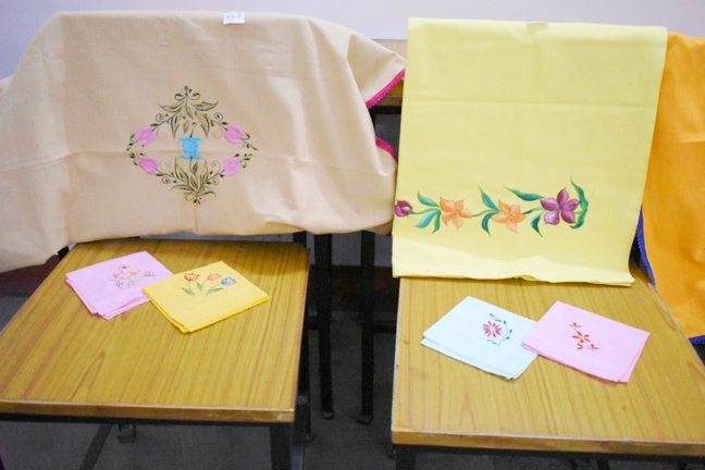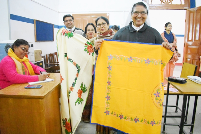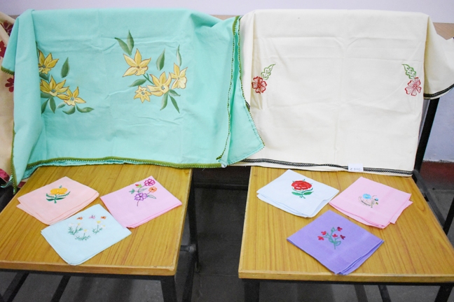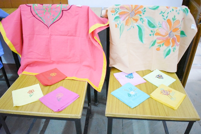 The Friends of Mary Ward put up a sale of table cloths and handkerchiefs embroidered and painted by them as an effort to raise fund for the poor. Sr. Rajini , our manager inaugurated the sale by cutting the ribbon. She was accompanied by Sr. Jyoti , our principal. Teachers visited the stall and purchased the items displayed.