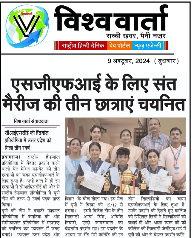 In CISCE National Handball Competition four students of St. Mary's Convent Inter College, Prayagraj have received Gold Medal.